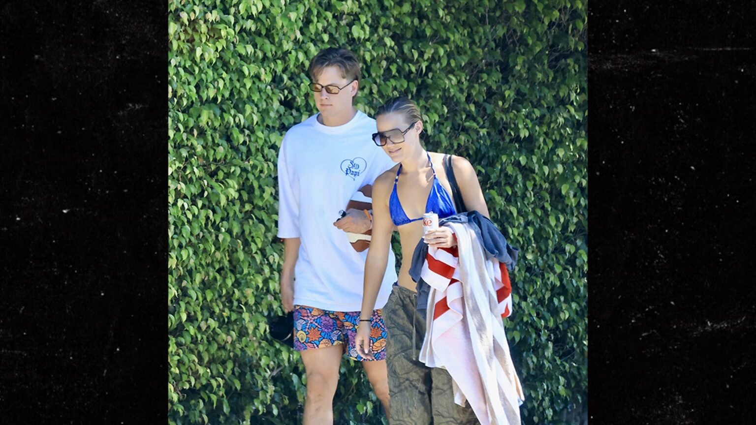 Burrow kept it chill for the Sunday bash, rocking a “Sad Papi” tee, colorful trunks and sneakers — staying gridiron ready with a football in one hand as he clutched a tumbler in the other.