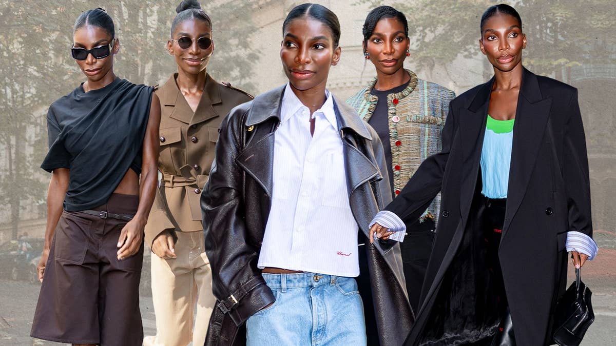The shoulder pads, belted waist and peplum cut created an exaggerated silhouette for Michaela’s statement Celine jacket. She completed the tonal look with the brand’s Cheri boots and Little Halfmoon Soft Triomphe bag.