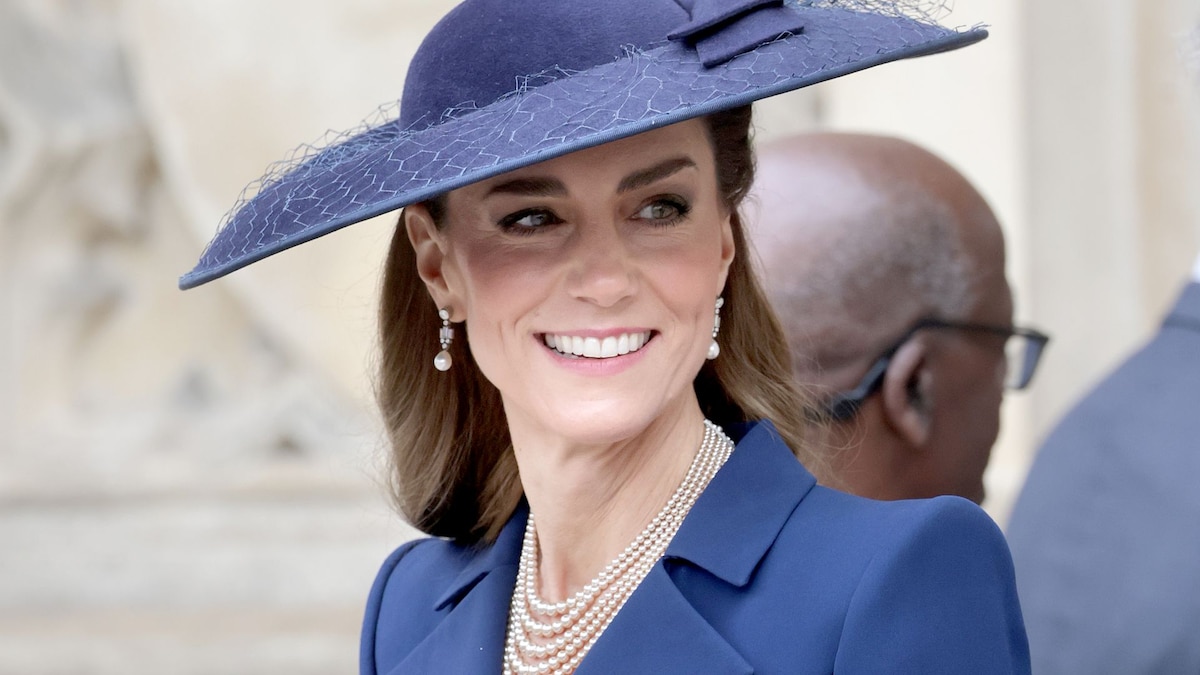 Kate paired a royal blue coatdress by Catherine Walker with a navy felt hat and a vintage-inspired five-strand pearl necklace from Susan Caplan. The piece, made of faux pearls and dating stylistically to the 1980s, has become one of her most recognizable accessories over the past year, appearing at several high-profile engagements, including Commonwealth celebrations and commemorations tied to the 80th anniversary of Victory in Europe Day.